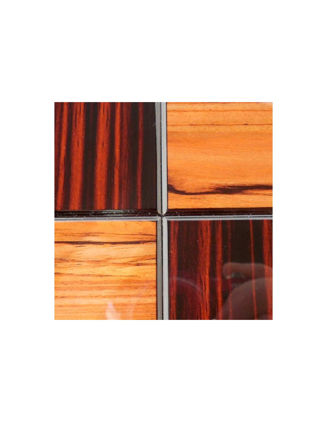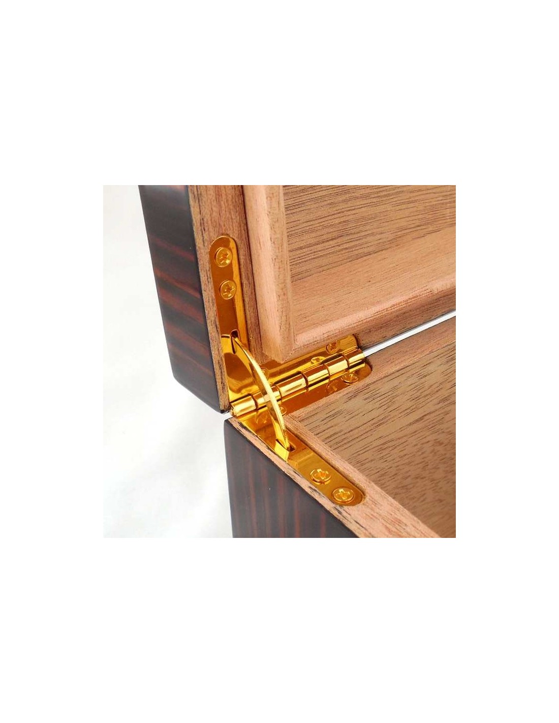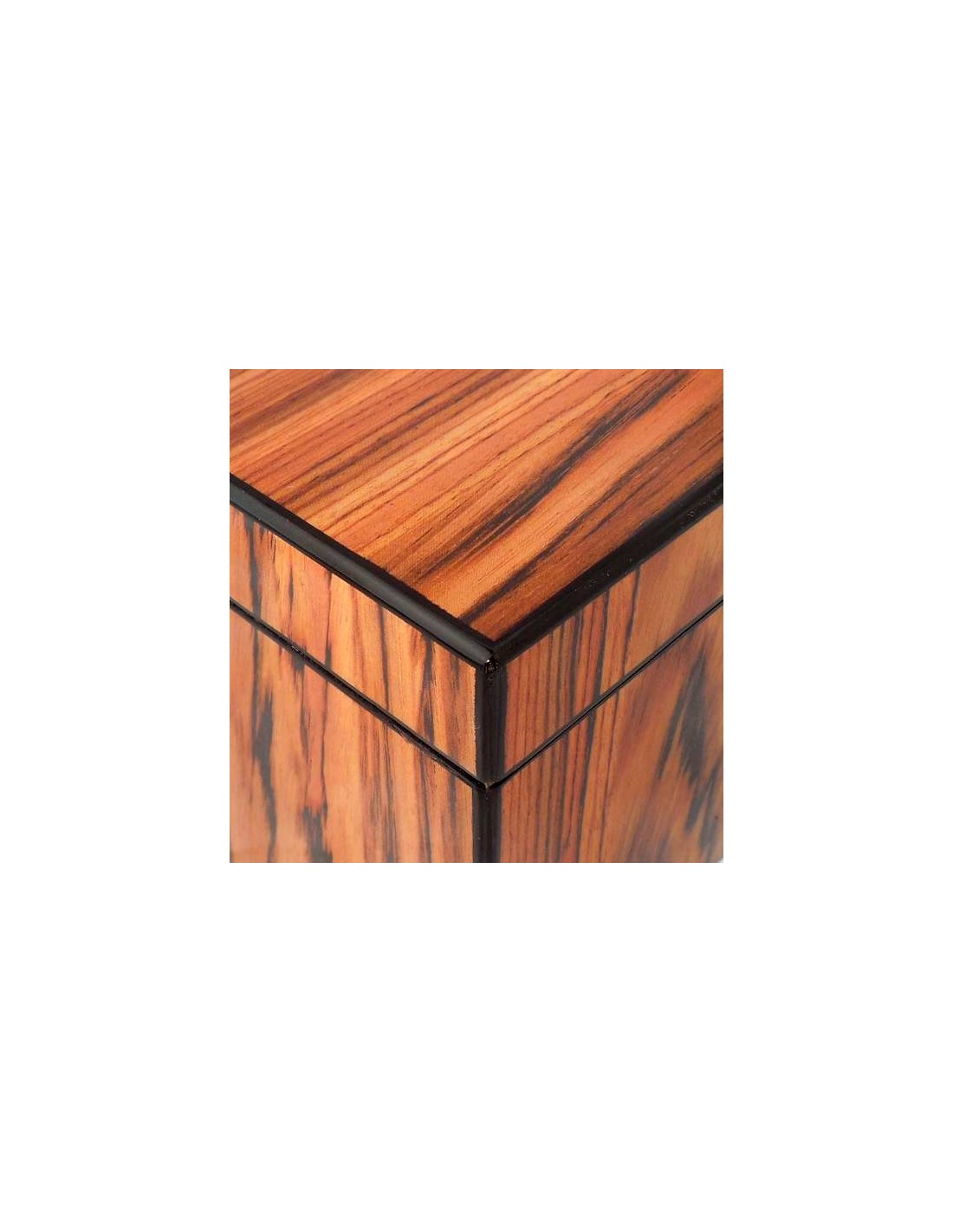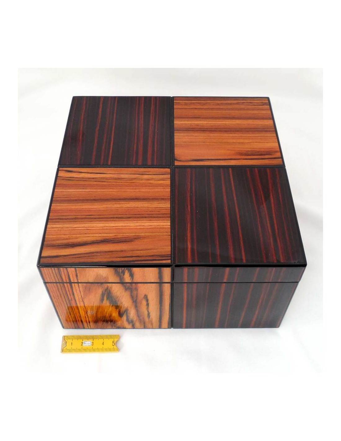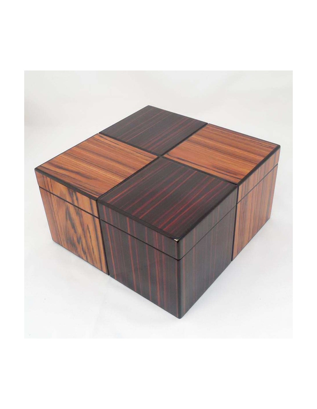 Cette cave à cigares présente de très beaux placages ébene de Macasser et Palissande de Santos. Elle est composée de 4 gros damiers, de forme carrée. Un profil bois dans le couvercle permet une bonne étanchéité pour une bonne conservation de vos cigares.