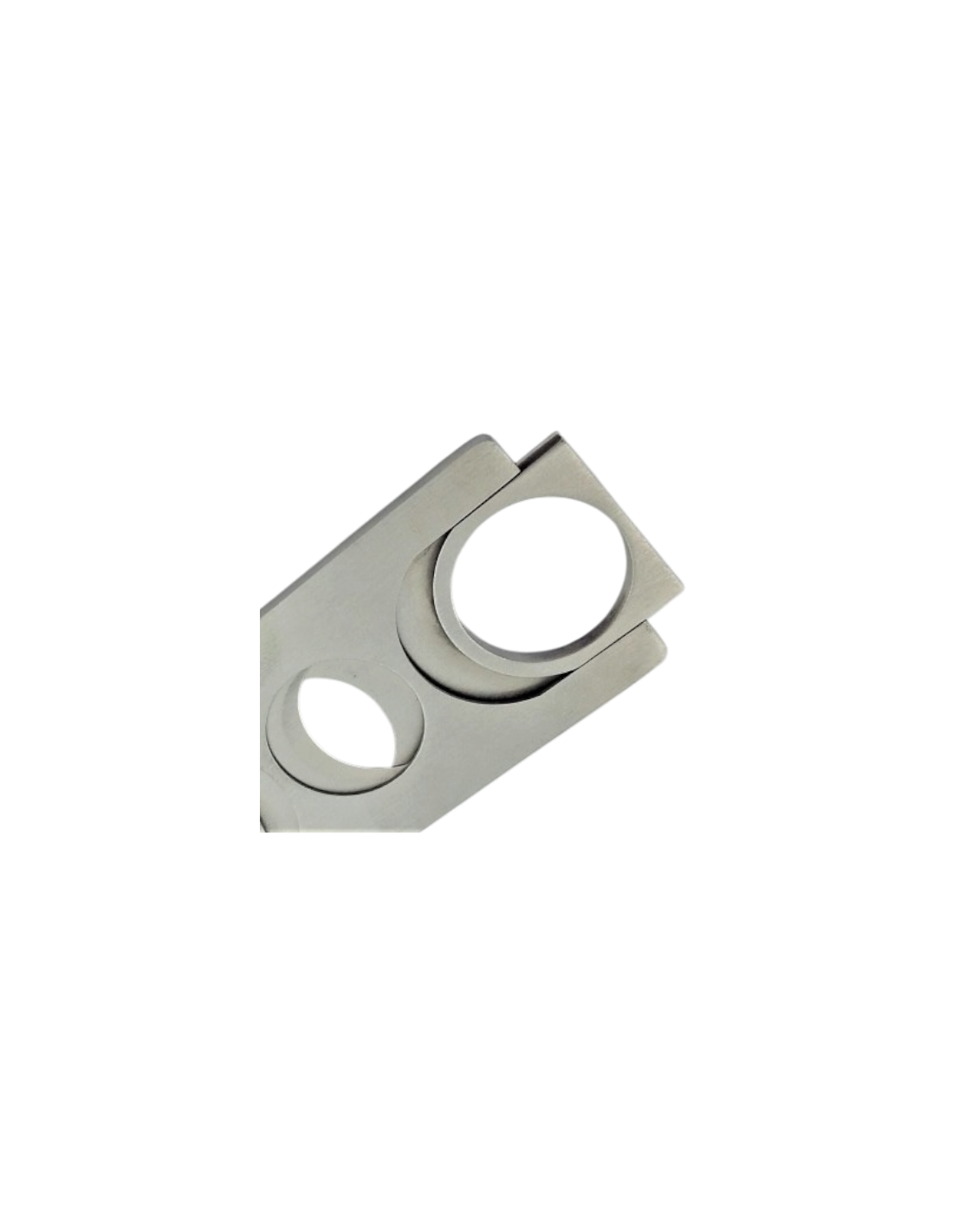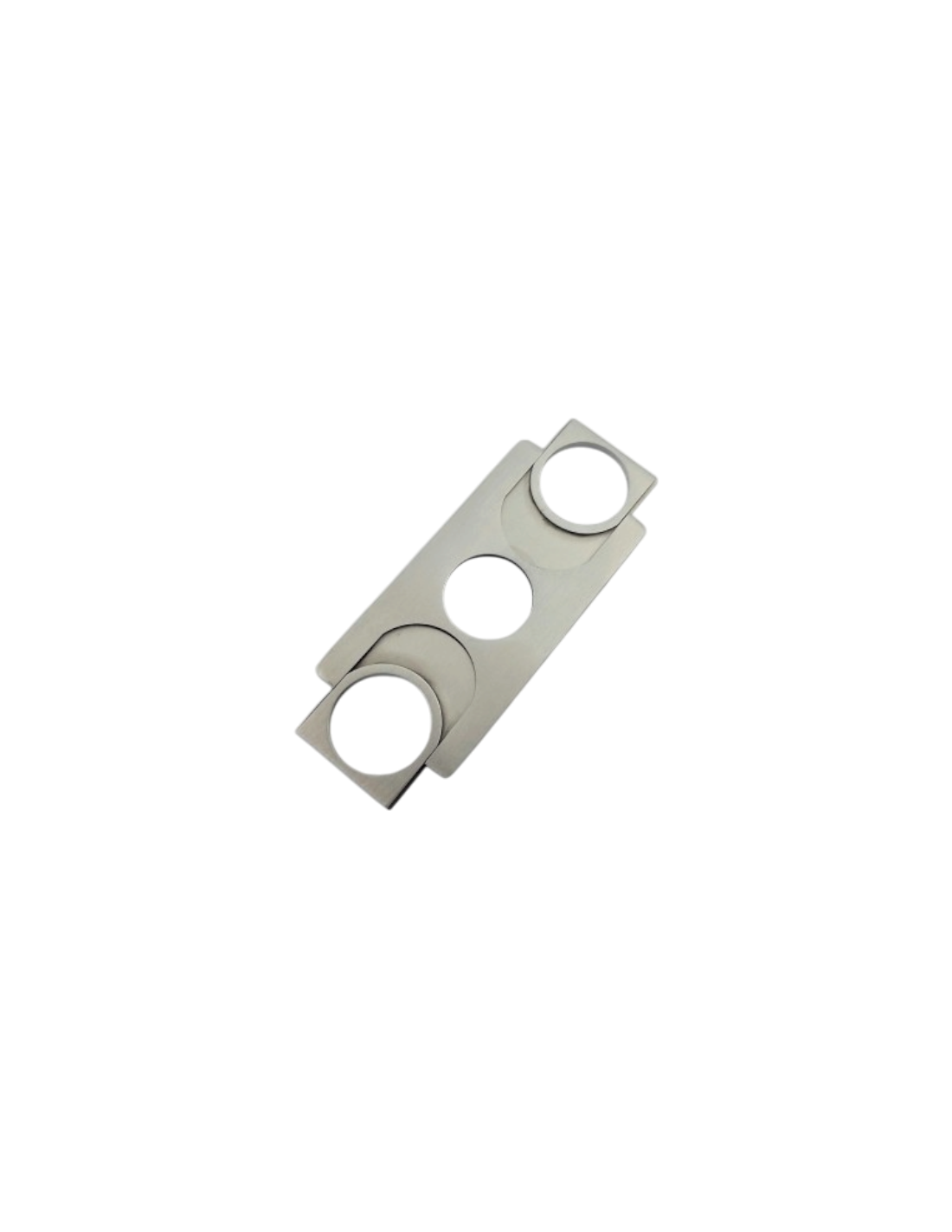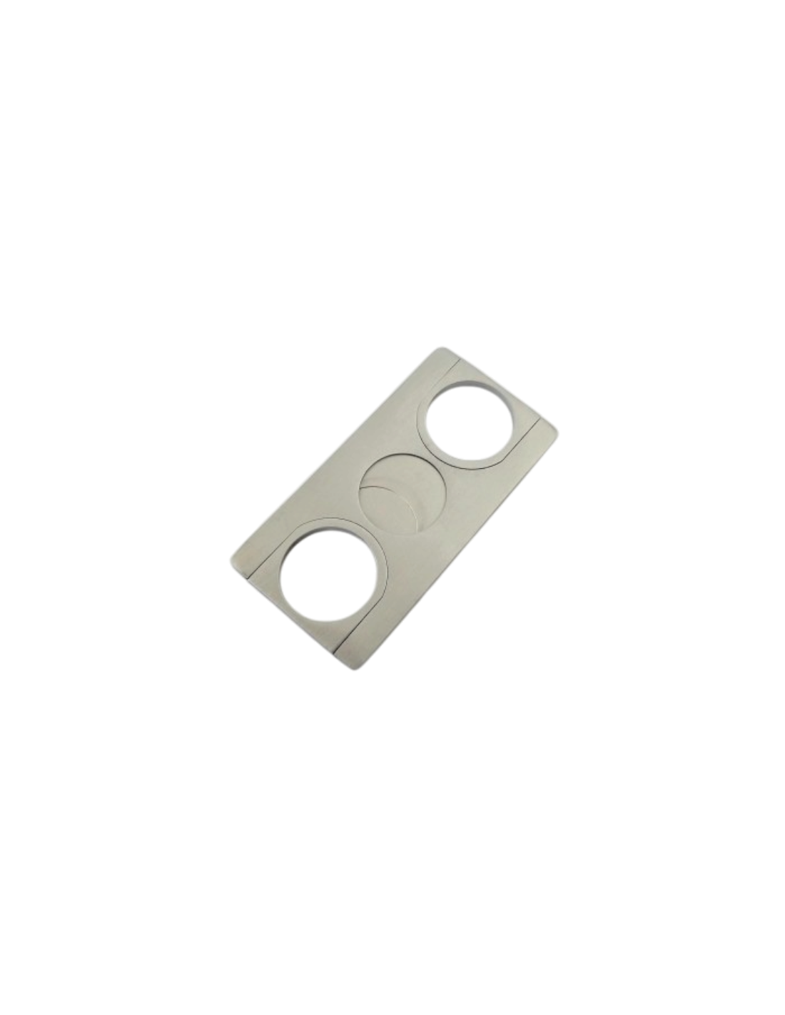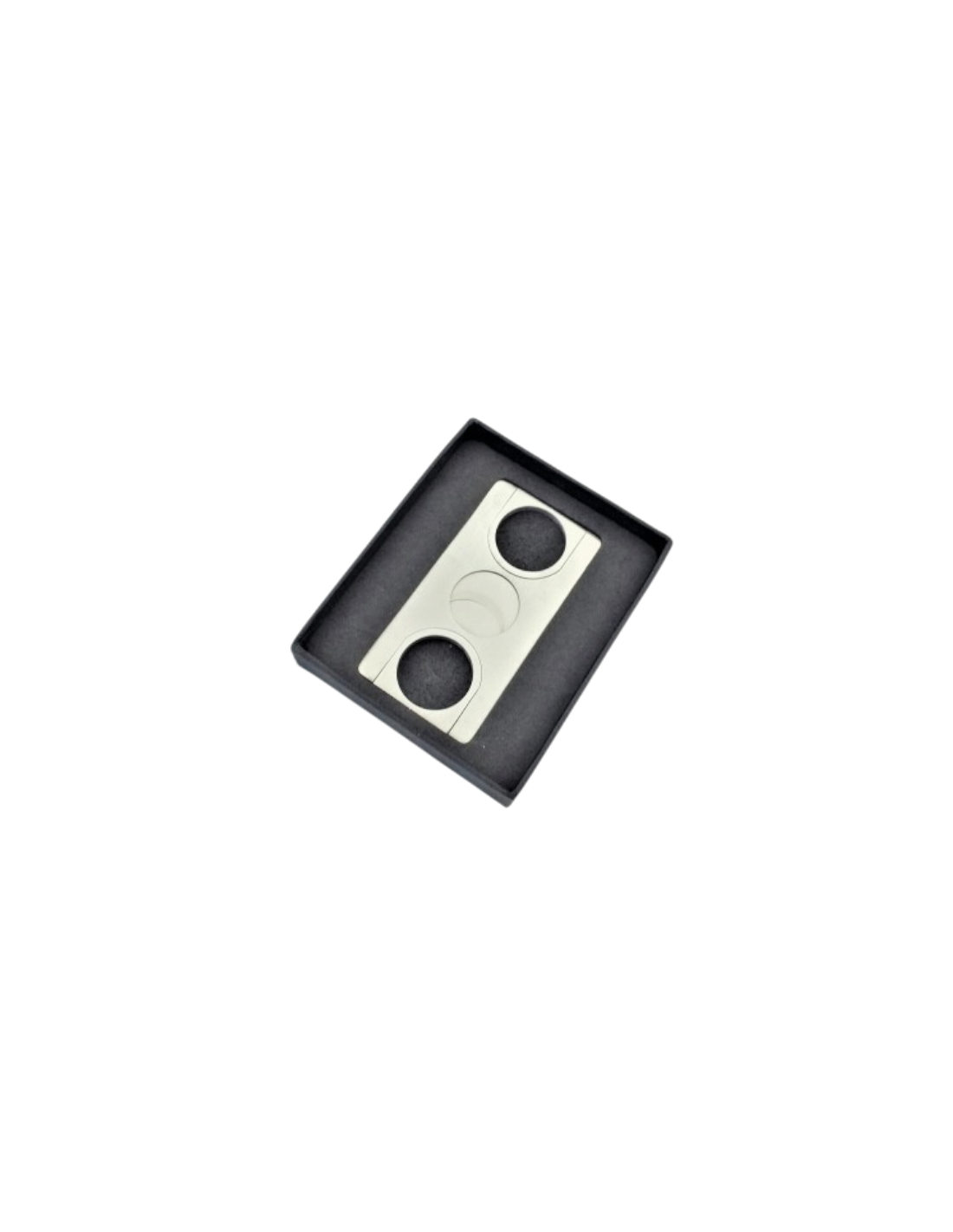 Coupe cigare double lame en acier inox brossé, sa caractéristique est une prise en main avec trois doigts ,ce qui permet de trancher les plus gros modules en toute facilité. Coulissement sans jeu des lames pour une coupe nette et précise.