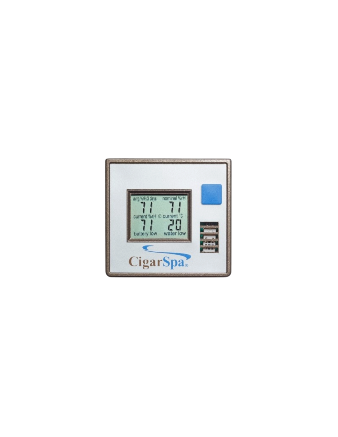 Thermo-Hygromètre électronique à affichage LCD particulièrement adapté aux vitrines à cigares et walk-in-humidor (local humidifié)Bonne précision en température (C° et F°), et en RH°, affichage XXL très lisible..
